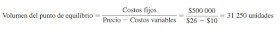 ¿Qué sucede si se fija el precio sobre la base de un cálculo de ventas demasiado optimista? Como con el precio de margen, el rendimiento realizado no alcanza al deseado, porque los costos fijos tienen que cubrir un volumen menor de unidades. El efecto de estas variaciones en el volumen puede examinarse mediante un análisis del punto de equilibrio. Supongamos que nuestro fabricante de electrodomésticos decide tasar sus cafeteras en 26 dólares. Con costos variables de 10 dólares por unidad y costos fijos de 500.000 dólares, la gráfica del punto de equilibrio que se da en la ilustración 1 muestra que el volumen del punto de equilibrio es de 31.250 unidades: ése es el volumen necesario para apenas cubrir los costos totales. Para calcular este resultado, se aplica la fórmula siguiente: